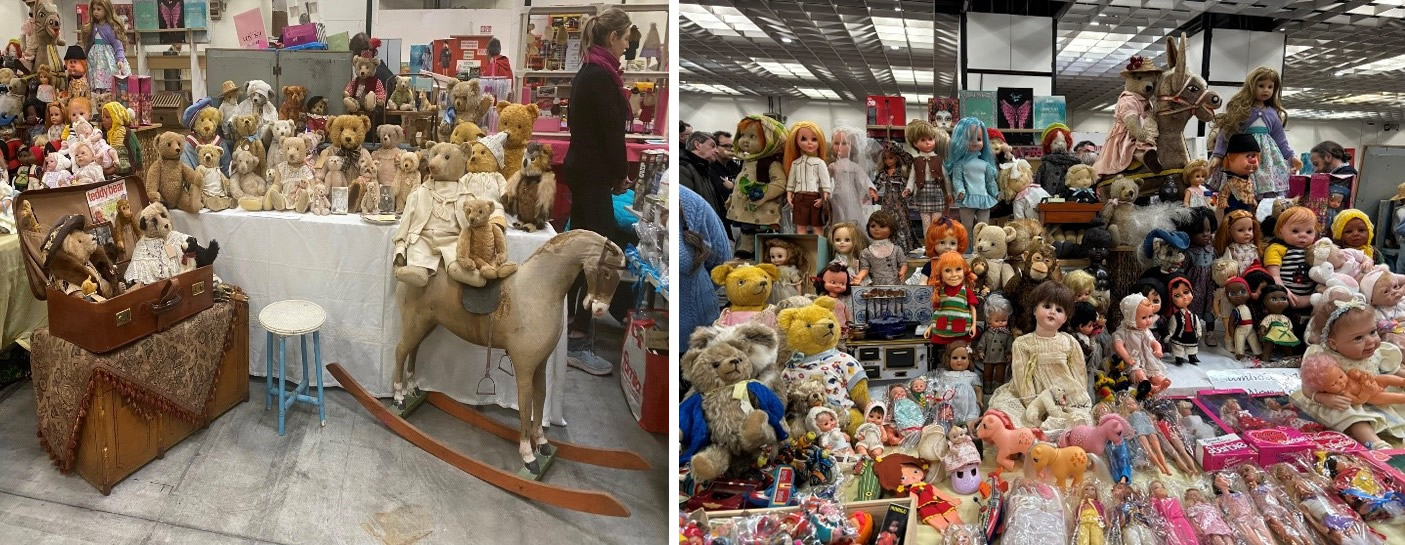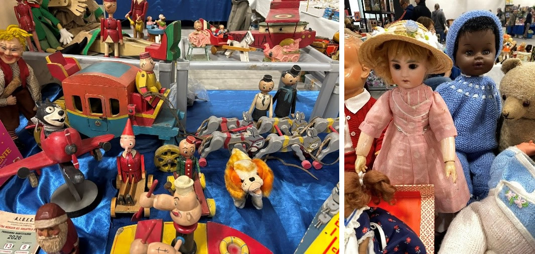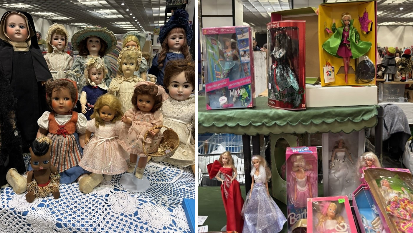 Sui tavoli erano esposti giocattoli d’epoca, bambole di biscuit vicino a Barbie in quantità, ma anche bambole in vinile e composizione